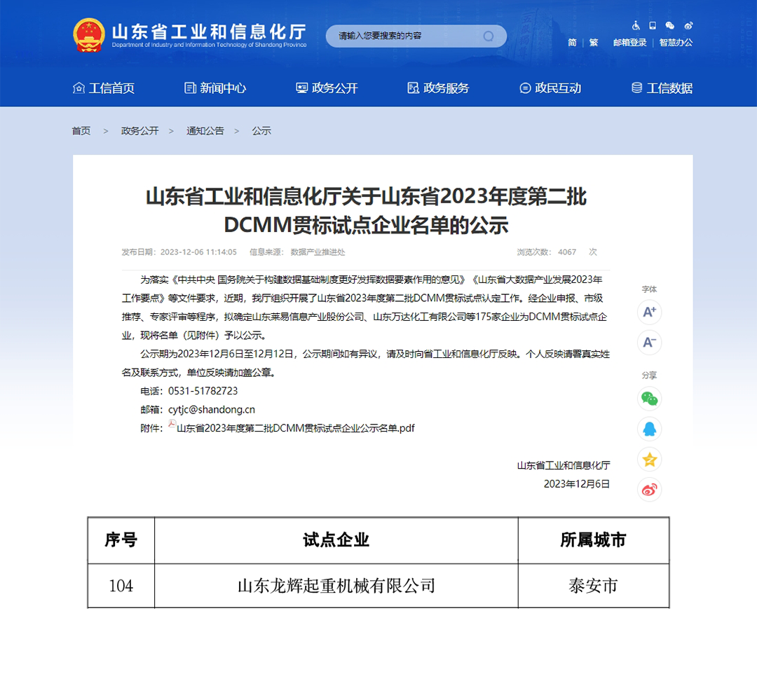 2023年12月06日,龍輝起重成功入選山東省2023年度第二批DCMM貫標(biāo)試點(diǎn)企業(yè)。